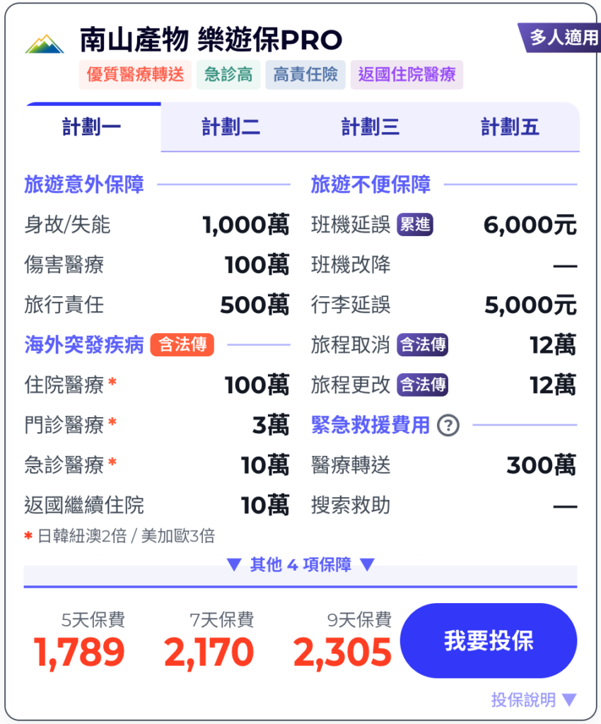 南山產物【樂遊保PRO】海外旅遊五日推薦方案約$879元起。更多方案理賠內容與價格,上 iCard.AI查詢。