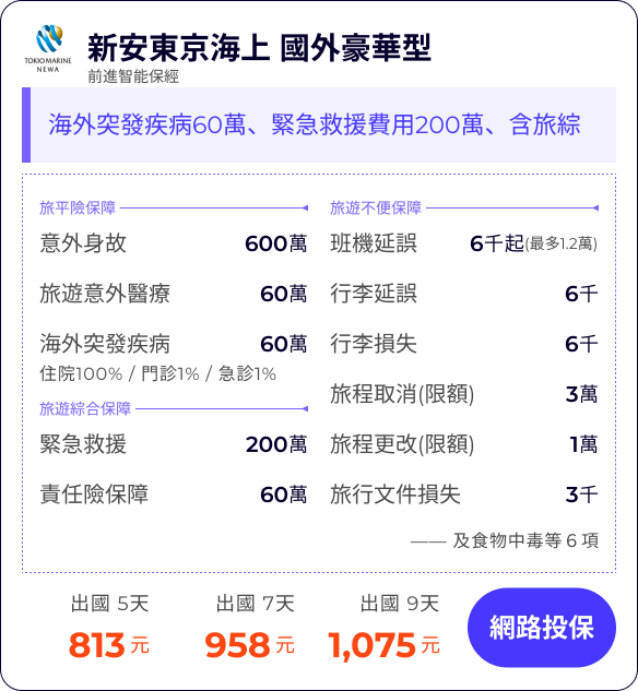 主要保障 | 意外身故/失能、意外醫療、海外突發疾病 | 班機延誤、行李延誤等6大項 | 責任險、緊急救援等 |