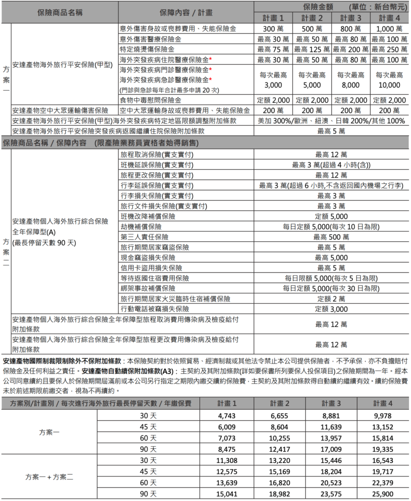 | 旅遊綜合保障 | 行程延誤: 定額2,000元或限額1萬 行李延誤: 限額1萬 行李損失: 限額2.5萬 旅行文件損失: 限額2.5萬 信用卡盜用損失: 限額3萬 劫持事故補償: 定額3萬 | – | – |