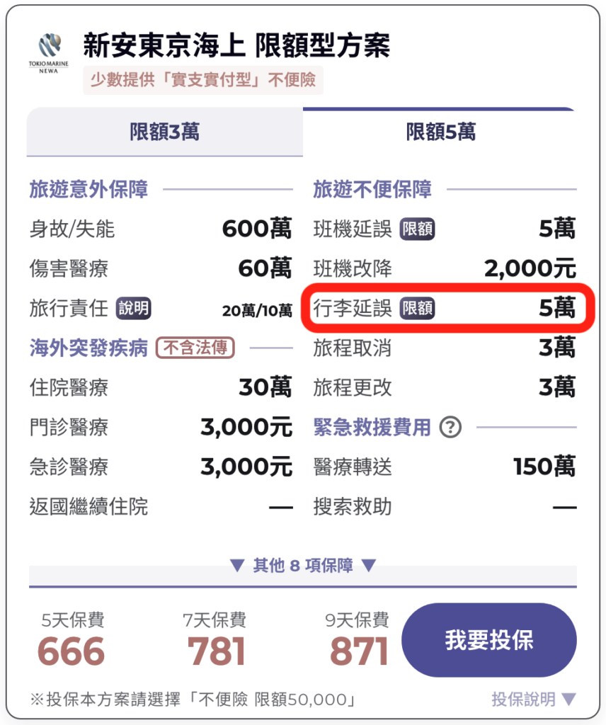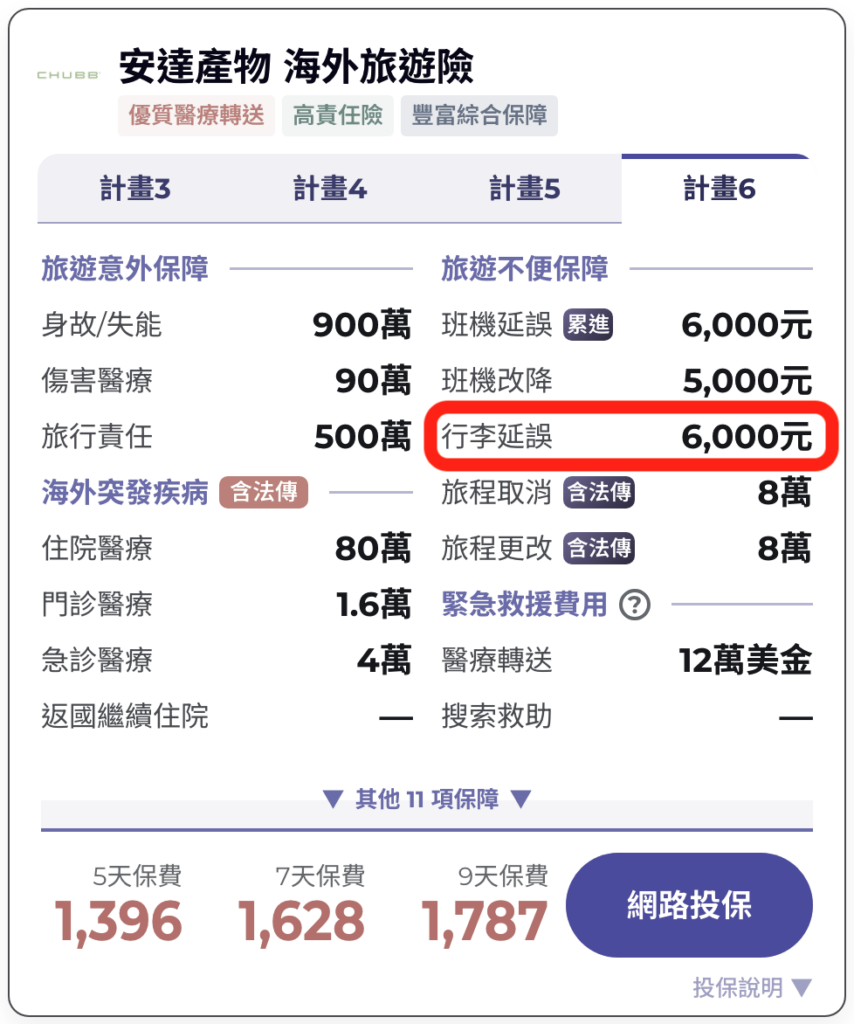 行李延誤保障還可根據理賠方式,分為「定額給付型」與「實支實付型」兩種。2026/4/1起,根據金管會規範,定額給付型的「行李延誤」每事故最高給付6,000元,保險期間內限2次。