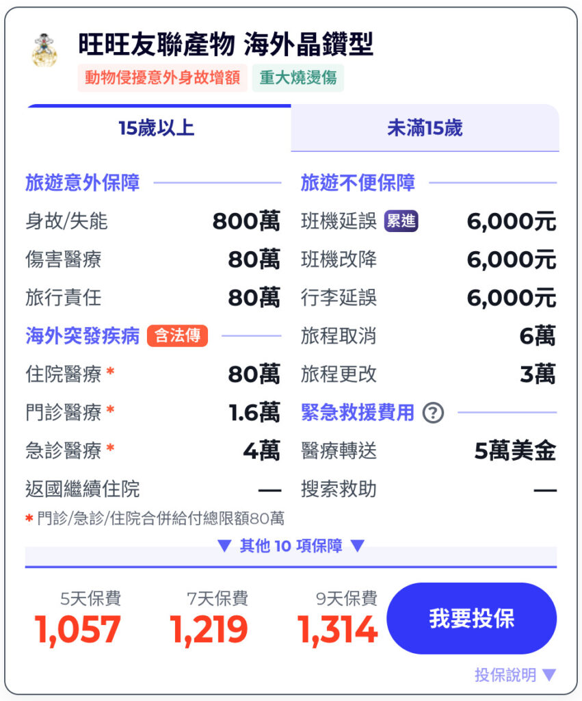 在「人身意外與醫療保障」這一塊,市售旅遊險共有這些保障項目,旺旺友聯產物旅遊險可以涵蓋如下: