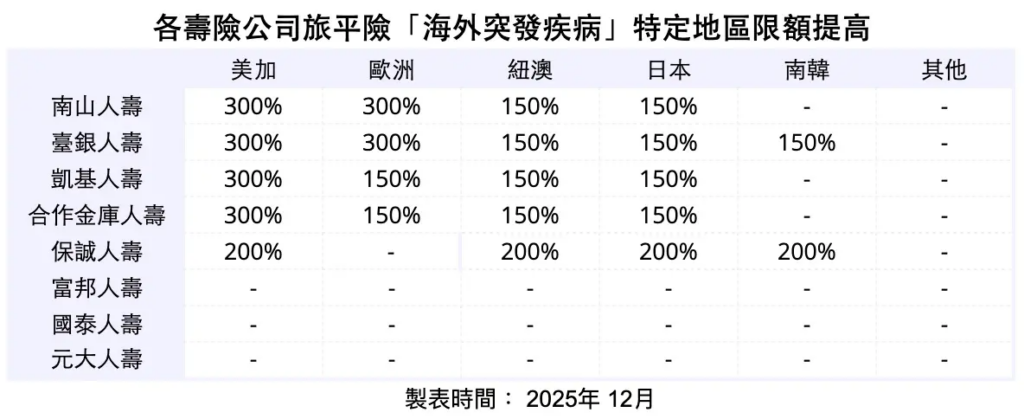 與傷害醫療保障相同,網路投保海外突發疾病最高限額為意外保額的10%。不過多數保險公司針對特定區域(如美加、歐洲、紐澳、日韓等地)會有「特定地區增額」,因此實際理賠額度可以更高。以下是各產壽險公司針對不同區域的增額倍數,或您也可以在商品卡上看到標示: