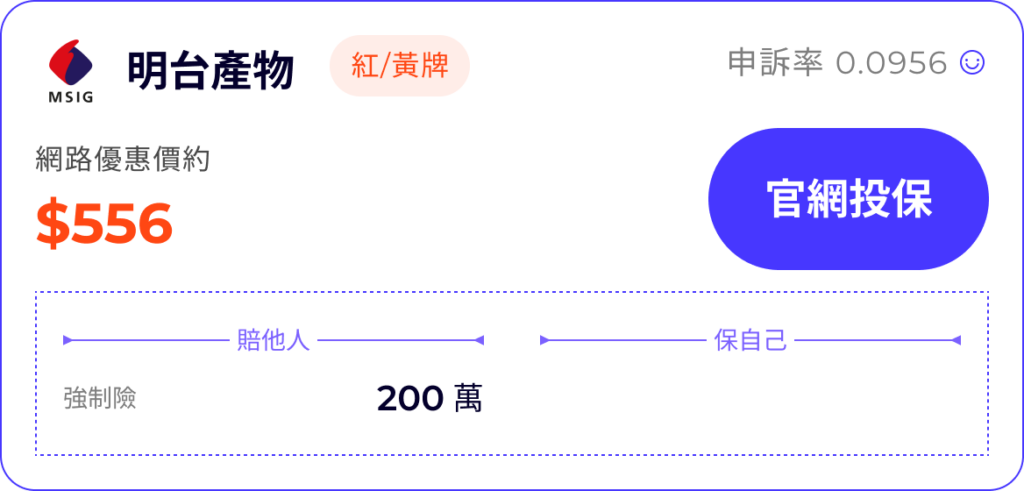 大型重型的保費是:一年期$711、二年期$1306,保費不會因為年齡/性別/無理賠年數有變化,但網路投保可享折扣。