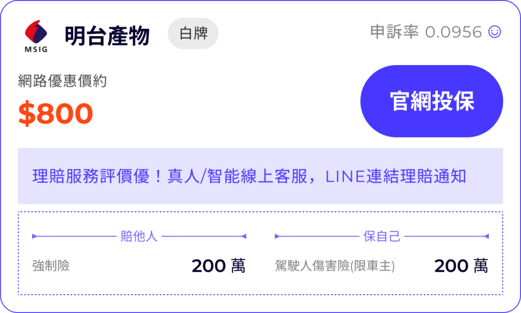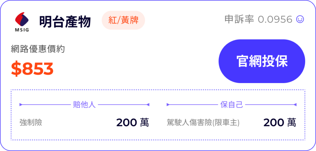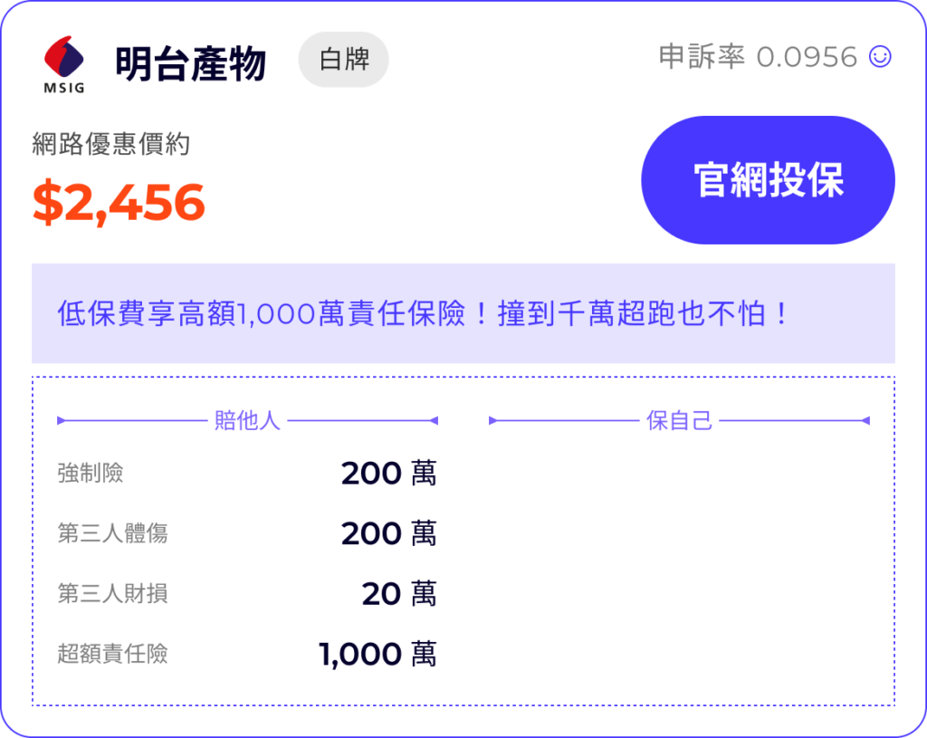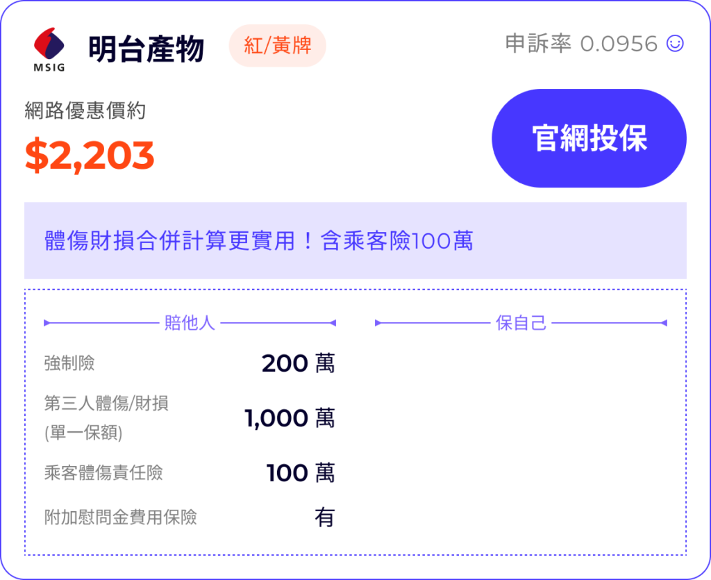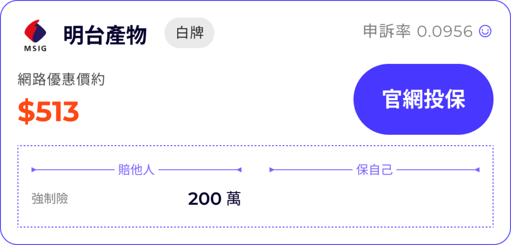 明台產險最推薦「強制險+第三責任險」的方案,保障足夠且保費便宜。詳細保費資訊請上 iCard.ai。