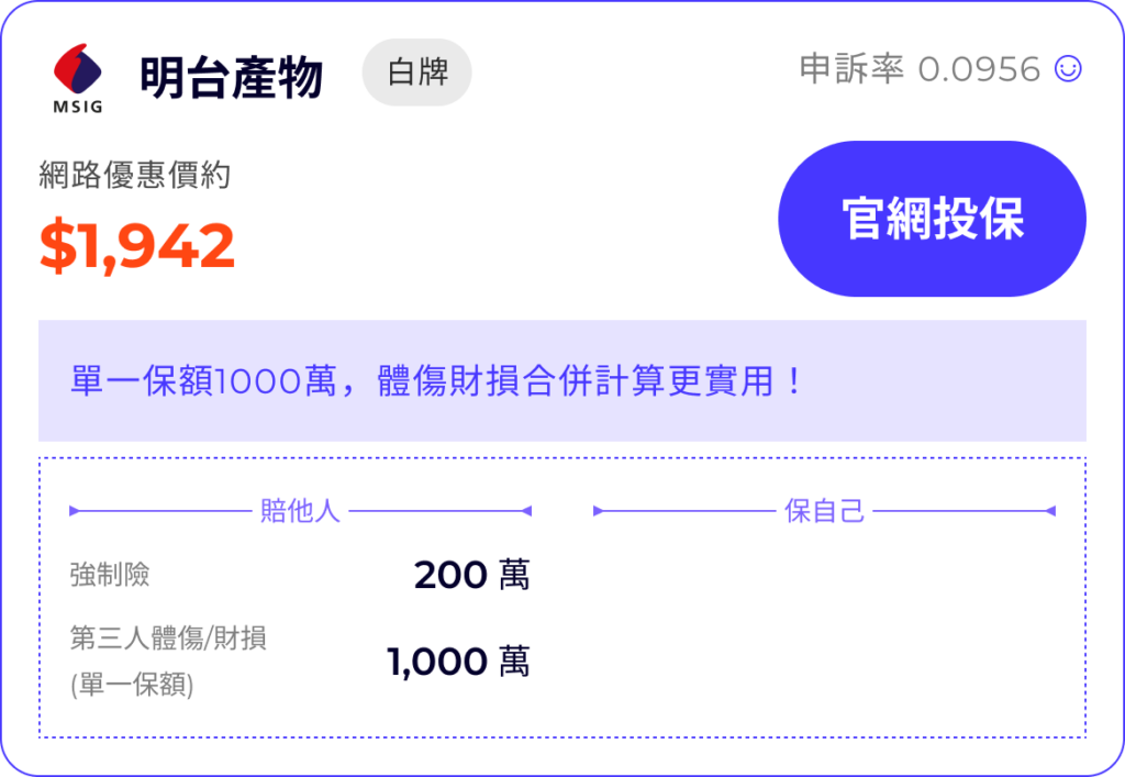 💡 以下任意險保費皆以「第一次投保,無投保紀錄」試算 (投保紀錄跟人不跟車,不分保險公司),如果曾投保過任意險並且無理賠紀錄,可享更低價格!